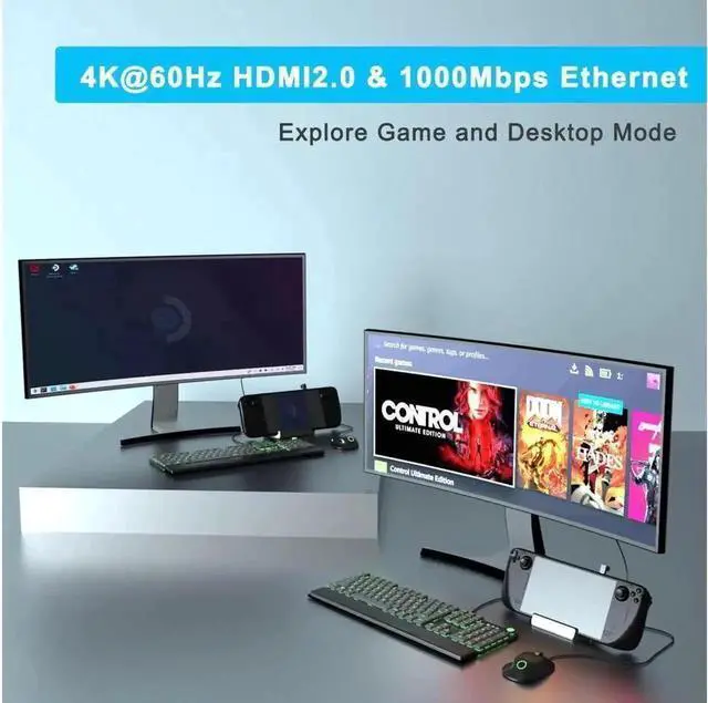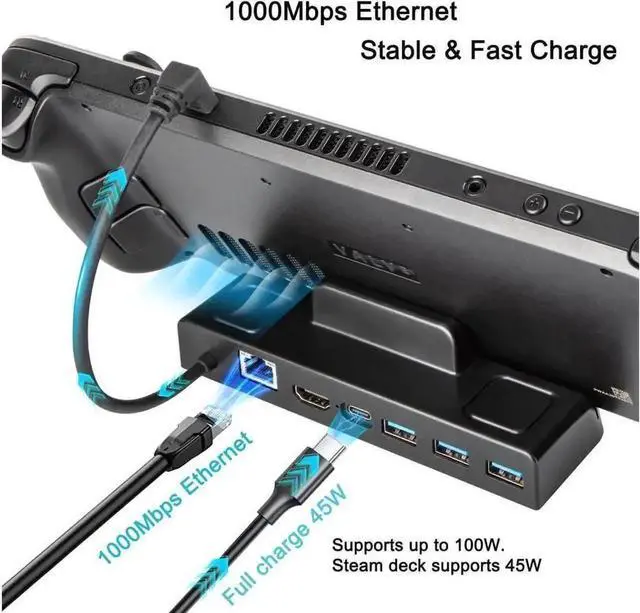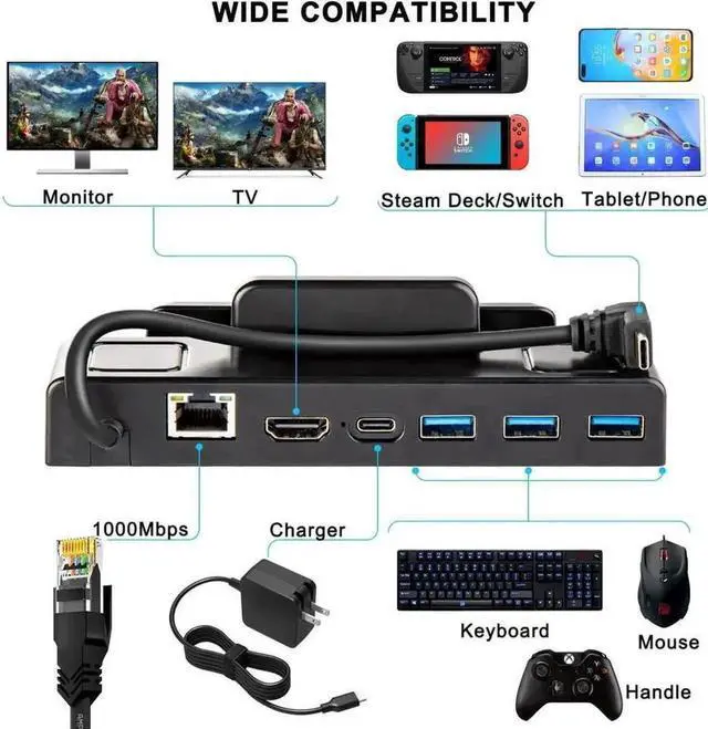 6-in-1 TV Docking Stand for Steam Deck: the TV dock is designed for Steam Deck, equipped with Gigabit Ethernet, 4K HDMI output, a USB Type-C PD fast charging port and 3 USB 3.0 data ports. You can enjoy playing video games on TV while your device is charging as well, 1000Mbps network high speed is for a better gaming experience, 3 USB 3.0 will let you acess to keyboards and mouse etc, you can go surf the web and do whatever you want on Desktop Mode.