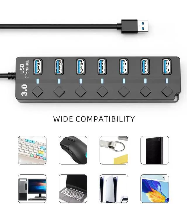 7-Port 3.0 USB Hub Splitter with LED Individual On/Off Switches and 1ft Extended Long Cable for Xbox, Flash Drive, Mobile HD, Console, Printer, Camera