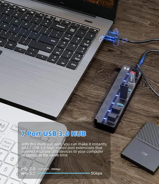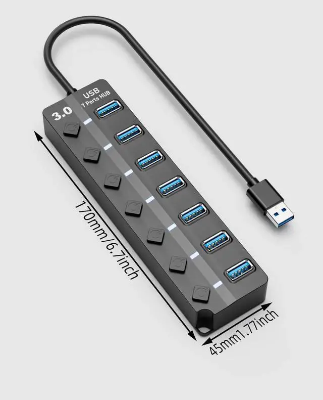 Usb hub with 7 individual on/off switches to control each USB port. USB 3.0 splitter hub saves the trouble of unplugging devices whenever you dont need it. Turn on/off the port at your need.