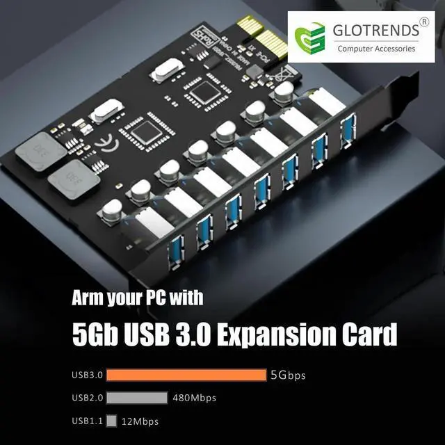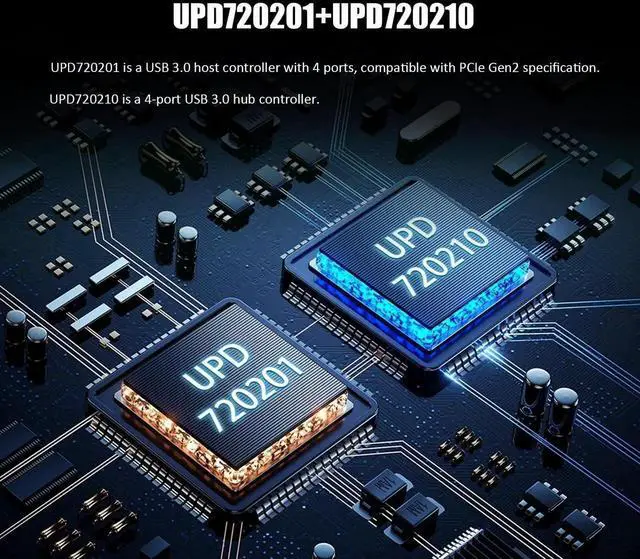 This 7-port USB 3.0 expansion card adds 7 Type-A ports to desktops, servers or NAS via a PCI-Express x1 slot. Powered by NEC720201+NEC720210, it is compatible with Intel, AMD and ARM platform, its 7 ports share 5Gbps of PCIe 2.0 X1 bandwidth.