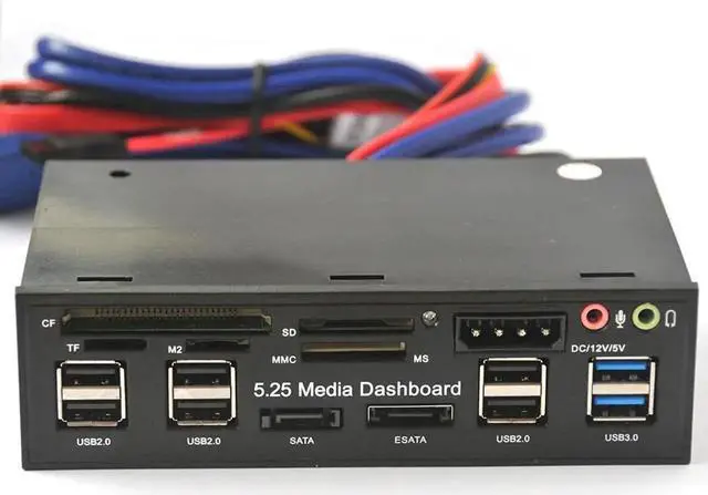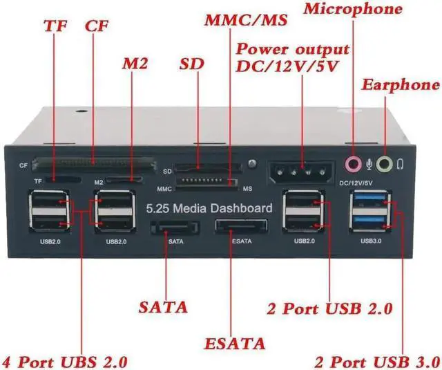 Front port: power 12V/5V output (SATA 15PIN Power Interface) standard round 4PIN turn to 15PIN power cable directly to the SATA hard drive power supply audio ports, front speakers, and microphone to solve the inconvenience of your chassis behind the plug More than 1 card reader, support SD / MMC / CF / MD, the MS / XD, TF / M2 series storage memory card