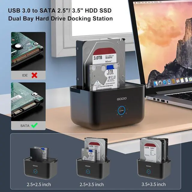 GODO Hard Drive Docking StationGODO 2 bay external hard drive docking station USB 3.0 supports all 2.5''/3.5'' SATA I/II/III HDDs/SSDs, support 2×18TB ,this sata hard drive dock compatible with Windows,Mac Os,Linux series