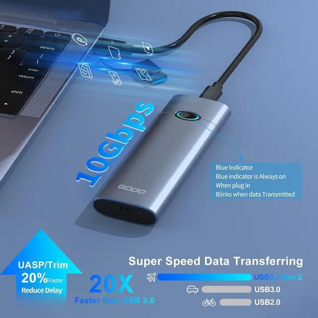 USB 3.2 Gen2 10Gbps Speed This M.2 Enclosure supports 10Gbps speeds of NVMe PCle, Support UASP, which can reduce data delay and waiting time, and increase the transmission speed of the SSD by 30%. Support Trim, which can enhance the efficiency of file recycling and solve the problem of SSD speed reduction. Therefore, you can directly open HD design files, 4K movies, etc. in the SSD without copying to the PC.