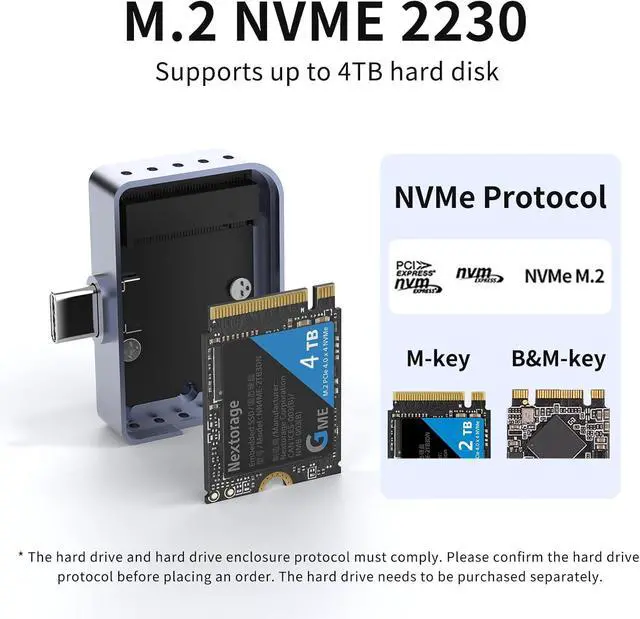 Applicable SSD - This M.2 SSD Enclosure is for NVMe PCIE M-Key / Type C connectors M.2 SSD. Applicable to sizes 2230 solid state drivers.Can be used with USB-C hosts, depending on the choice of device.