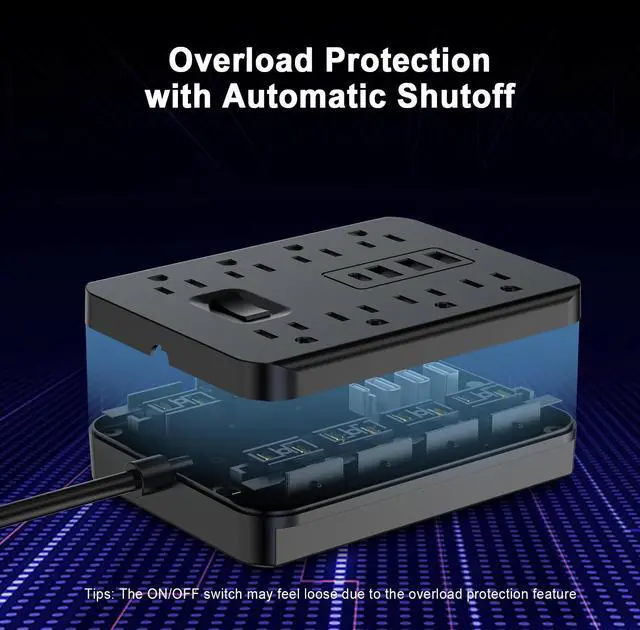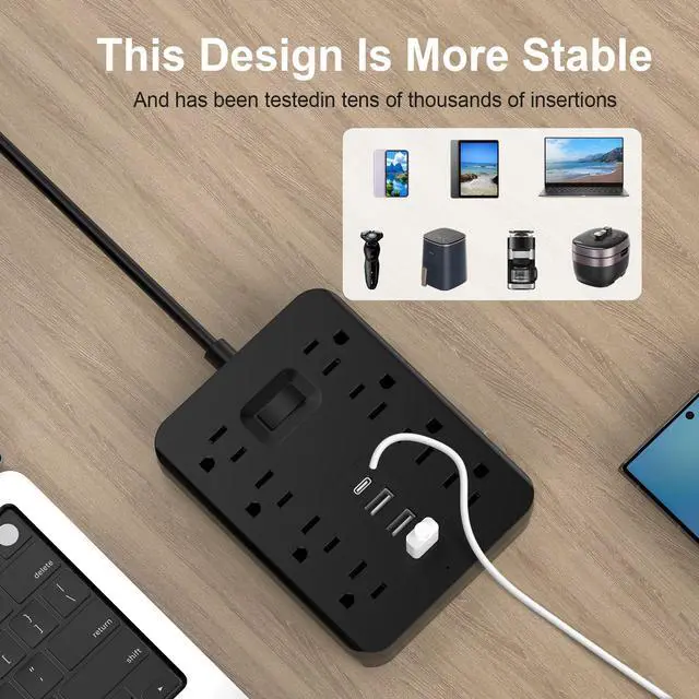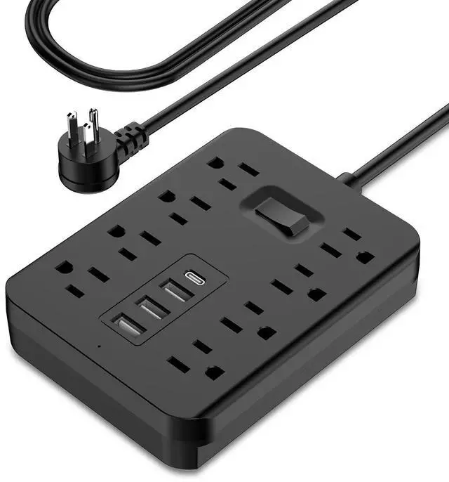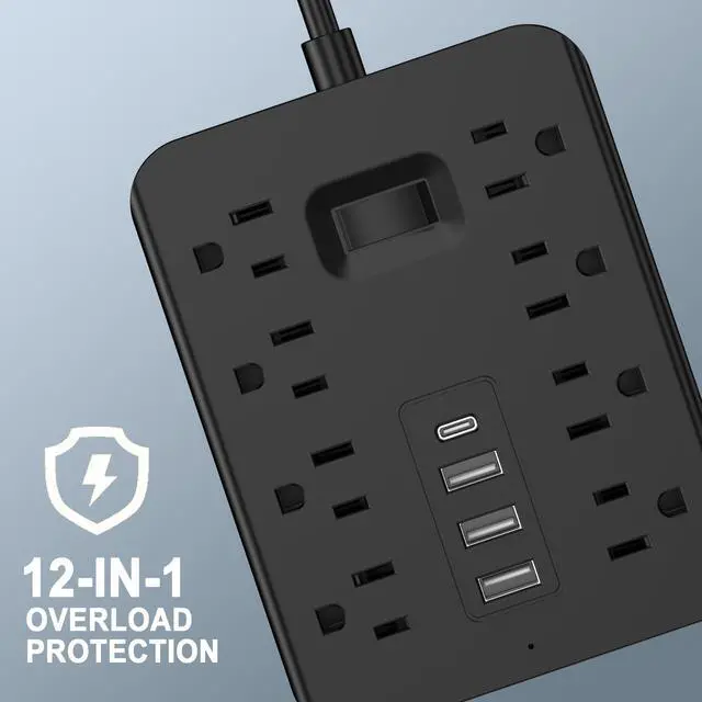 Title: EL-24 12-in-1 Power Strip 8 Outlets + 4 USB Ports. Black Braided Cable. Master Switch.