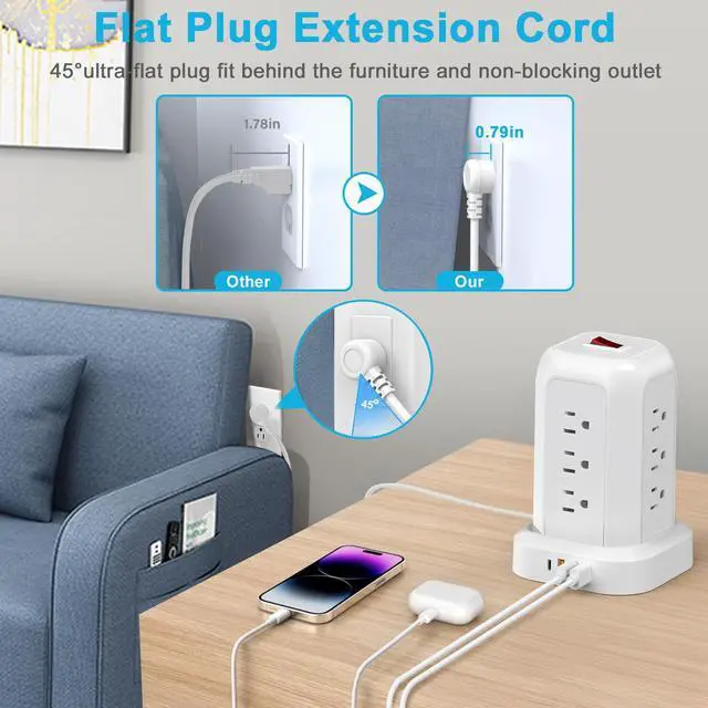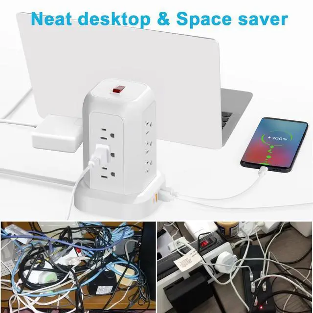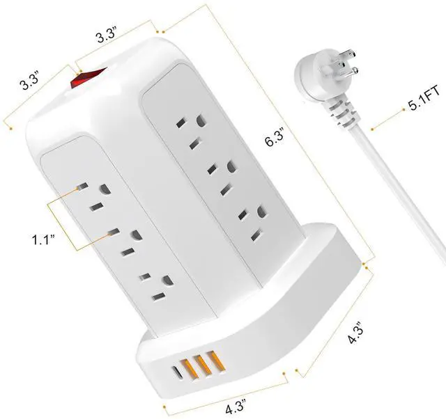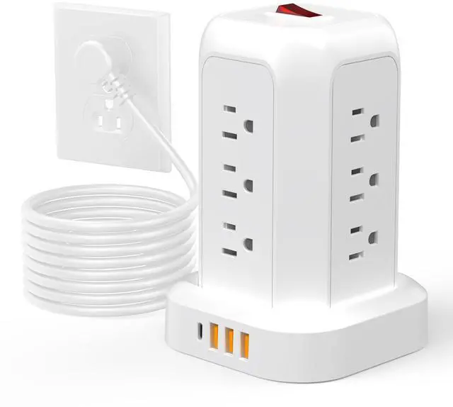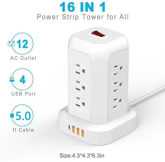 Title: T-12 Tower Power Strip 12 Outlets + 4 USB Ports. Vertical Space-Saving Design.