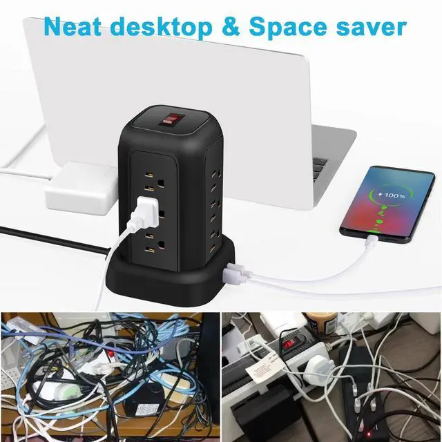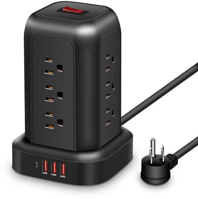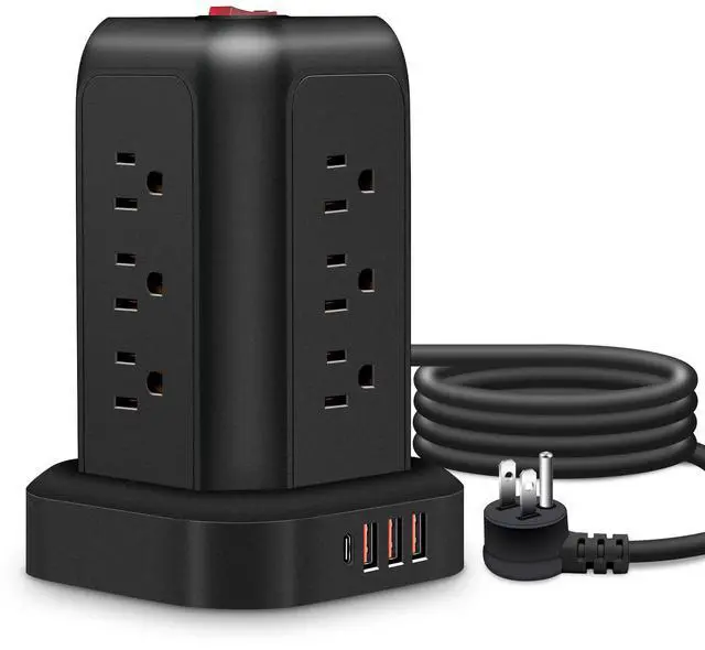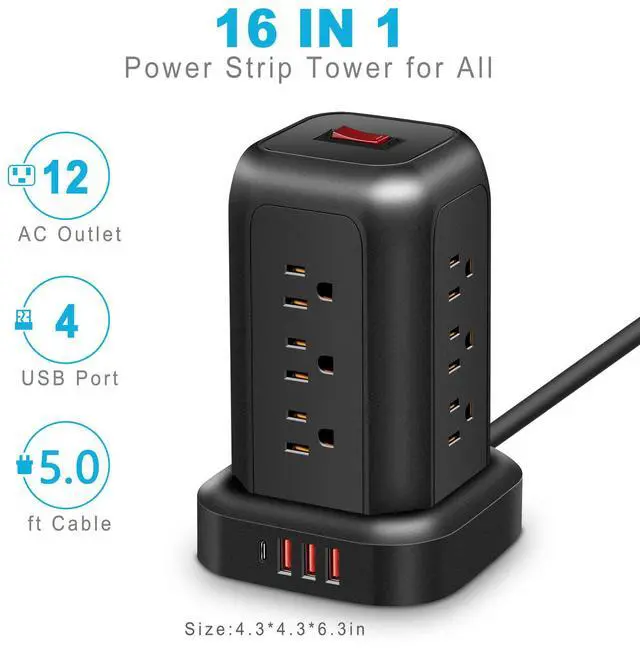 Title: T-12 Tower Power Strip 12 Outlets + 4 USB Ports. Vertical Space-Saving Design. Black.