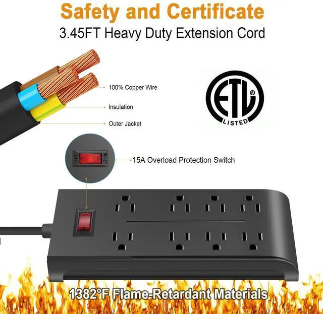 • UL/ETL Listed North American Safety Standard UL and ETL certified for USA and Canadian safety standards. Rigorously tested for electrical safety and fire resistance. Trusted for commercial and residential use. Rated for 1250W, 10A total power.