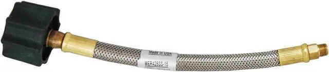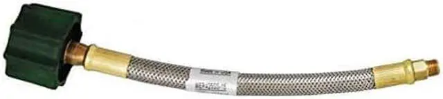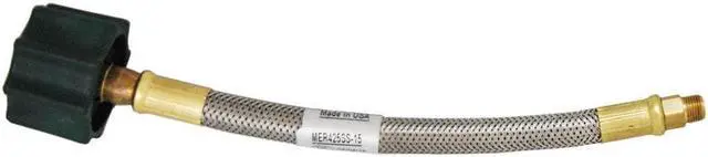 MEC Stainless Steel braided pigtails are for connecting propane cylinders to the propane regulator. The Stainless Steel braid provides added protection to the hose along with the safety features of thermal protection in case of fire and excess flow protection in case of broken gas line. Female QCC, Type I connection x 1/4" inverted male flare. MEC green Type I Nut for use on RV application ONLY. (200,000 BTUH).