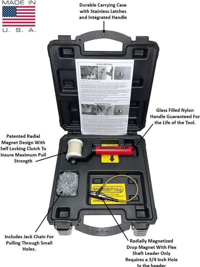 New design: BMCASE N/C. This incredible tool will give you a return on your investment the first time you use it! MagnePull cuts wire fishing time by up to 70%! Eliminate multiple trips in & out of attics and crawl spaces. This amazing tool magnetically couples the cable-pulling device through drywall & allows technicians to have complete control. The system was developed to work with wood studs, insulated walls, and for metal studs you will need the OPTIONAL XP1000-8 Magnet! Great for Alarm, Cable, Satellite, Home. Note*** Designed for Professionals only, not designed for DIY applications.