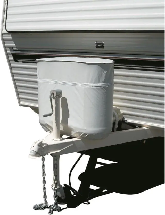 Protect propane bottles while Camping or in storage with this deluxe heavy-duty vinyl Propane Tank cover. Molded nylon zipper combined with a pressed board top. Hollow bead welt cord and elastic shock cord. UV and cold crack treated.