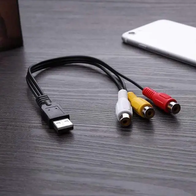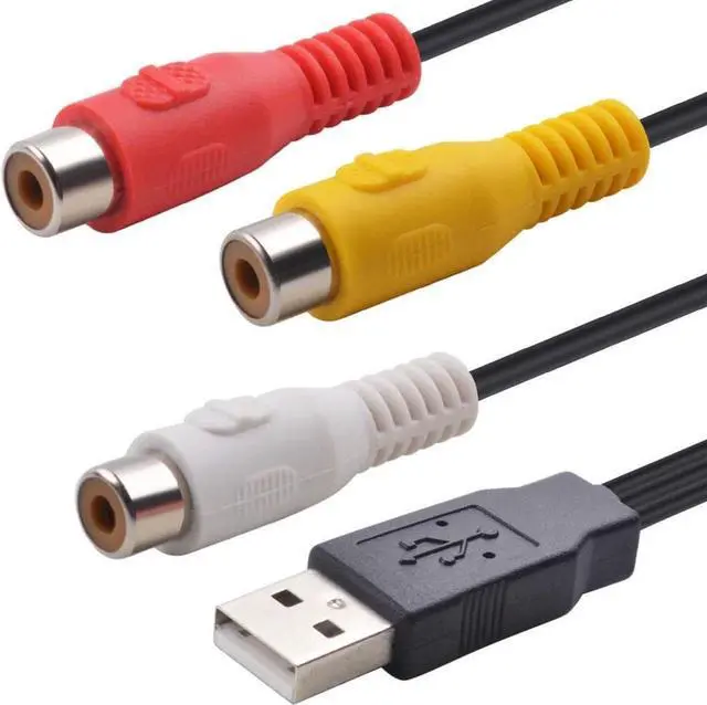 1 x USB plug male to 3 x rca female audio video AV adapter cable. USB male on one end - three colors coded female RCA jacks on other end.