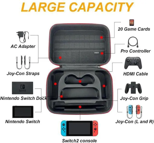 Large Capacity --- The Nintendo Switch 2 csae With dedicated compartments, all necessary devices such as the console, base, AC adapter, and controller can be stored in a convenient and sturdy casing. It can also hold up to 20 game cards, making it easy for you to find the games and other accessories you want to play next, providing quick and tidy storage space for your travels