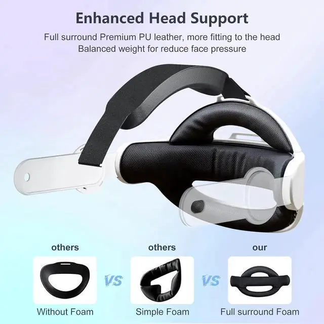 Soft Top Flexible Strap ---- The Strap For Quest 3S/3 has increased top strap head cushion thickness ( 0.67 inches) can effectively improve the comfort and reduce pressure when wearing the headset, and the soft PU leather surface makes it very easy to clean the cushions.