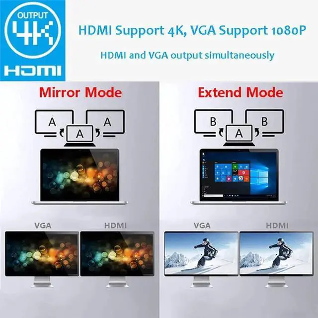 * True-to-Life 4K (HDMI-VGA) display with our USB-C hub, you can effectively perform high-resolution screen conversion. You can support two additional monitors in (HDMI/VGA, mirror mode. Mirror or expand your screen to a TV, monitor or projector, 4k@30Hz resolution. 1x up to VGA output.