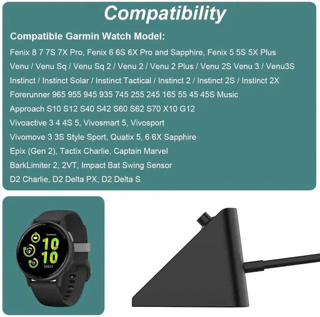 Compatibility: This charger for Garmin Watch Fenix 8 8S 8X 7 7S 7X Pro 6 6S 6X Pro 5 5S 5X Plus, Forerunner 965 955 945 935 745 265 255 245 55 45, Approach S10 S12 S40 S42 S60 S62 S70 X10 G12 S12, Vivoactive 3 Music 4 4S 5, Vivosmart 5, Vívomove Sport 3 3S Sport Style, Vivosport, Venu 2 Plus 2S, Venu Sq, Instinct Tactical Solar Edition, Instinct 2 2S 2X, Tactix Charlie Delta, Quatix 5 6 6X Sapphire, Captain Marvel, D2 Charlie, D2 Delta PX S, Impact Bat Swing Sensor, BarkLimiter 2, 2VT, Striker Cast, Epix (Gen 2), Enduro 2 Smartwatches. ( 3.3 ft/1m usb charging cord)