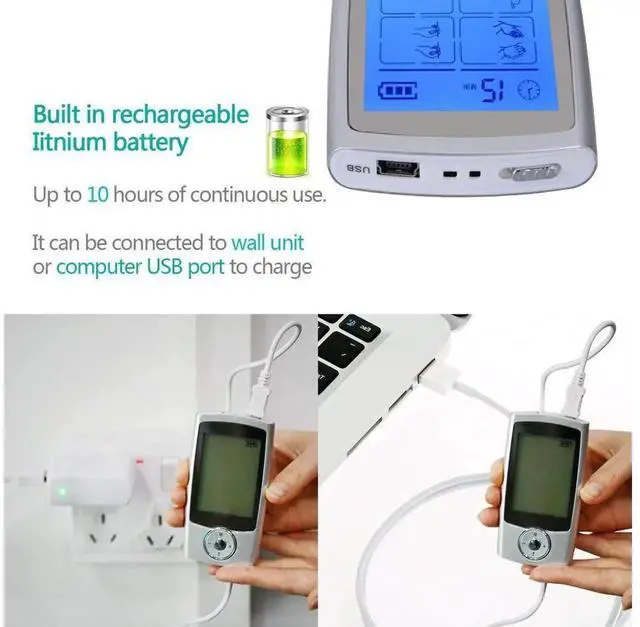 BUILT-in RECHARGEABLE LITHIUM BATTERY: Up to 10 hours of continuous use, It can be connected to wall unit or a normal USB port to charge. Don't worries about treatment interruption for dead AA batteries any more. With battery level indicator remind you charge timely. Pain Relief - Targets your pain precisely, Effective and Safe By placing the pads exactly at the site of the pain, you get fast relief, without having to digest potentially harmful or addictive prescription medicine.