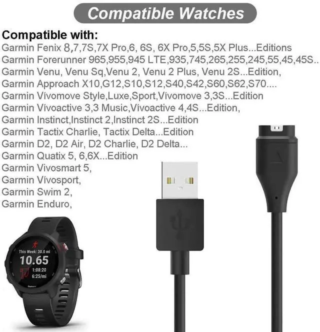 Commpatible Watches: This charging cable compatible with Garmin Fenix 8 7 7S 7X 6 6S 6X Pro 5 5S 5X Plus and Sapphire Editions, Forerunner 45 45S 55 245 Music 745 935 945 LTE, Approach S10 S40 S60 S62 X10 G12 S12 S42, Vivoactive 3 Music 4 4S, Vivomove Sport 3 3S Style, Vivosport, Venu, Venu Sq 2 Plus 2S, Instinct Tactical Solar Edition, Tactix Charlie Delta, Quatix 5 6 Sapphire, D2 Charlie, D2 Delta PX S, Swim 2, Enduro Smartwatches