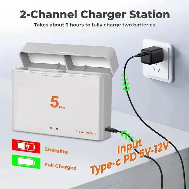 5V3A USB-C Dual-Slot Fast Charging Charger: Kit with LED Dual-Slot charger and SB-C fast-speed charging cable, 2 packs 2100mAh batteries for osmo action 4 can be quickly charged on same time within 2-3 hours. Moreover, the USB-C cable support various charging sockets like wall charging sockt with usb-c port, power bank, car charging, computer and so on.