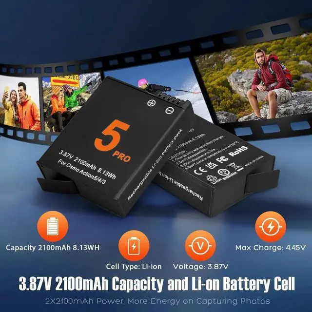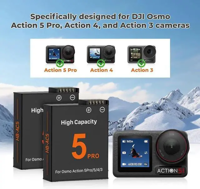 Compatibility: Replacement Action 5 batteries 2 packs are specially designed on 1:1 of original OSMO action 5 pro batteries that are fully comaptible with OSMO Action 5 Pro, OSMO Action 4, OSMO Action 3 cameras.