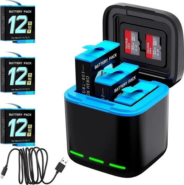 Storage Design Charger --- 3-Channel unique and compact Charger designed with a closed lid with 2 SD card slot (SD card is not included), can storage and charge 3-Pack Hero 12/ 11/ 10/ 9 batteries simultaneously. The cover of the charger has a magnetic suction design. And the battery charger staion with Smart LED Indicator Light, Red for charging, Green for charging completed.
