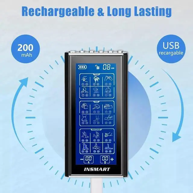 Powerful battery: The package includes a USB cable that connects to a wall charger, mobile power supply or laptop USB port for charging. With up to 20 hours of use on a single charge, it is more environmentally friendly than AA batteries and lasts longer than other machines. Our Tens units come with a power indicator to remind you to recharge!