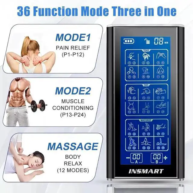 The 36 Mode Muscle Stimulator combines 3 therapies in 1 device. TENS provides safe, non-invasive, drug-free pain relief; EMS helps activate muscles and can be used as a training tool to help increase strength and endurance; and massage helps relax the body, relieve fatigue, and improve sleep.