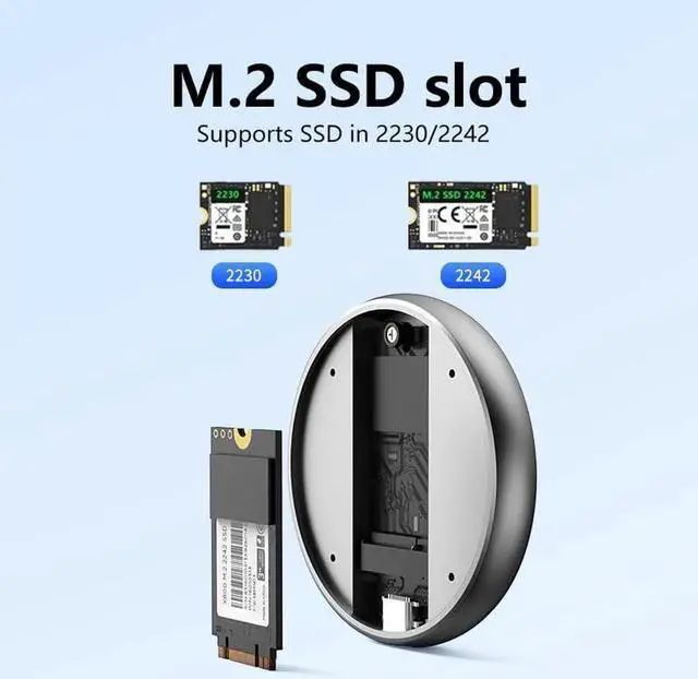 Notifications about NVMe M. 2 SSD Chassis USB C 10Gbps Portable Aluminum SSD Chassis This M. 2 NVMe SSD chassis does not support M. 2 SATA NGFF SSD or SSD with heat sink, only support NVMe SSD less than 3.5 mm thick. To perfectly reflect product performance (up to 10Gbps), please connect this M. 2 SSD chassis to devices with USB 3.2 gen 2 standard interface. When you need to remove the SSD, please perform a safe removal of the device before disconnecting it from your device. Do not forcibly remove NVMe M.