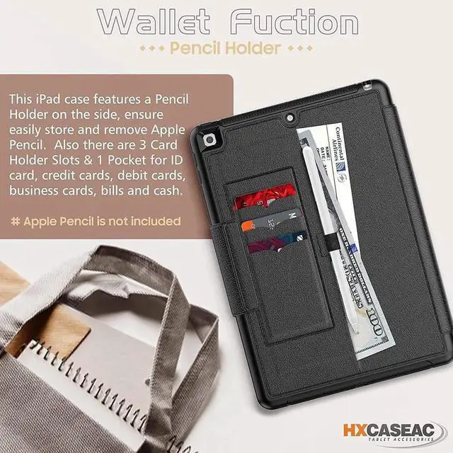 | PENCIL HOLDER & CARD SLOTS | - iPad 9th / 8th / 7th Generation case designed to carry your Apple Pencil safely and securely. This iPad case features a Pencil Holder on the side, ensure easily store and remove Apple Pencil. *Apple Pencil is not included. Also there are 3 Card Holder Slots & 1 Pocket give enough space for ID card, credit cards, debit cards, business cards, bills and cash.