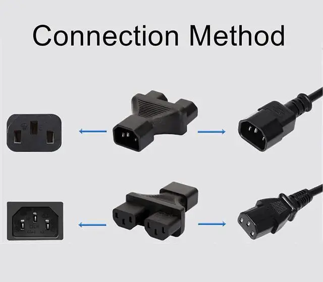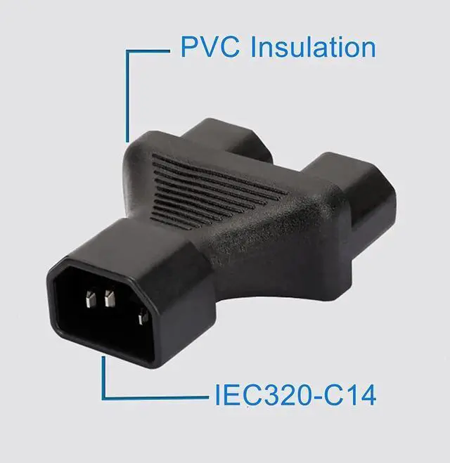 C14 to Dual C13 AC adapter current: 10A, voltage: 110-250V, application: PDU or UPS server.