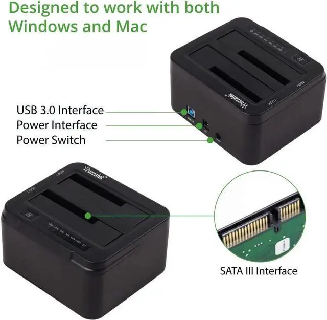 Deigned for direct insertion of two 2.5 or 3.5 inch SATA HDD. USB 3.0 SuperSpeed interface, transfer rates up to 5Gpbs. Backwards Compatible with USB 2.0.
