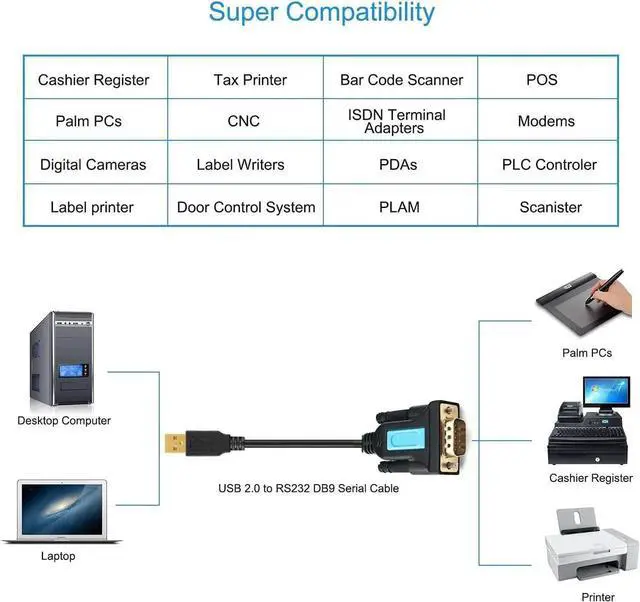 Built in Prolific PL-2303 Chipset, widely compatibility with Windows 10, 8, 7, XP, Vista, MacOS, Linus.