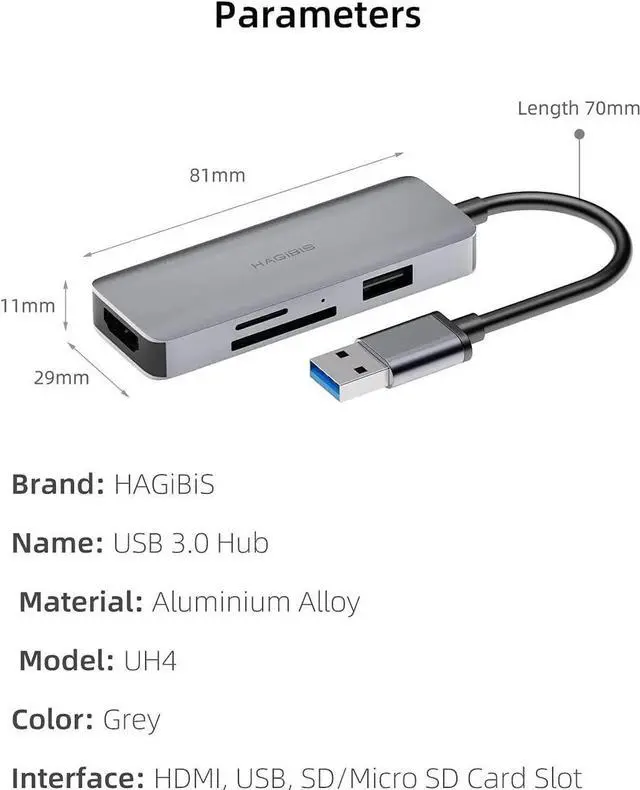 USB 3.0 hub includes: 1*USB 2.0 port, 1*HDMI port, SD& Micro Card slot. Can easily convert a Type-A USB port to 1080p@60Hz HDMI port. Ideal for multi-screen working, home office, conference and entertainment