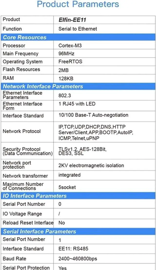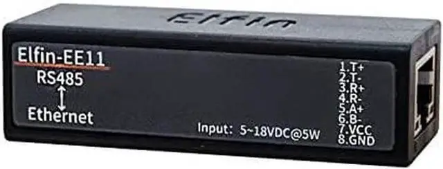 The Elfin-EE1X unit is a complete solution for serial port device connecting to network. This powerful device supports a 10/100BASE-T Ethernet connection, a reliable and proven operating system stored in flash memory, an embedded web server, a full TCP/IP protocol stack, and standards-based (AES) encryption.
