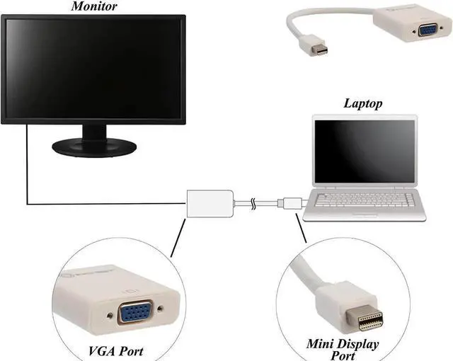 Compatible with DisplayPort 1.1 and 1.2 specifications Supports VGA output resolutions up to 1920x1200 Allows you to connect to a VGA Display for a larger work area. Adapter is 9.25 in length (cable length is 5.8 in) Mini DisplayPort to VGA Female