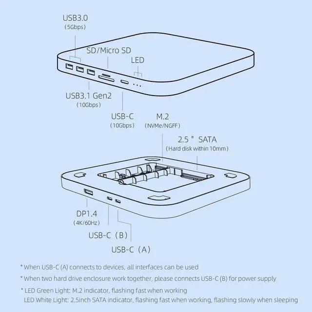 Dual Hard Drive Enclosure Design: Compatible with M. 2 (NVMe / NGFF) and 2.5 inch (Mechanical / Solid State) hard disk (Hard disk within 10mm), support dual hard disk read and write at the same time