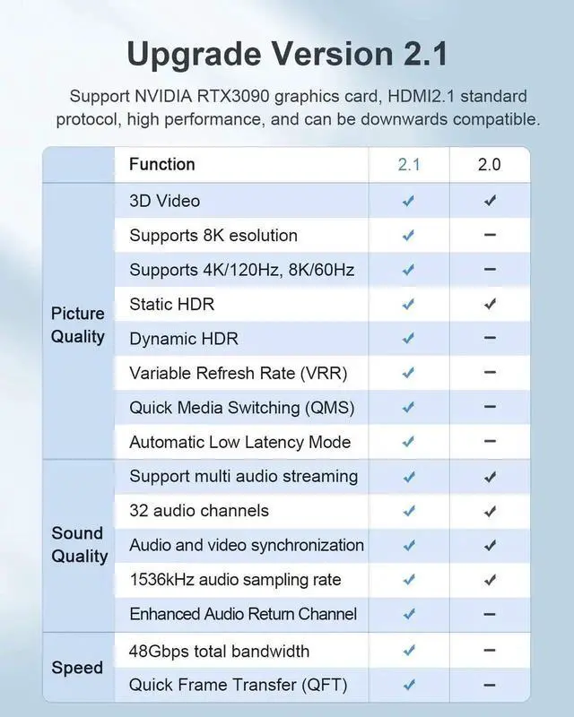 Ultra HD 144Hz HDMI 2.1 Cable 8K60, 4K120 & up to 10K resolution, Dynamic HDR, eARC, ALLM, QFT, QMS, VRR, and compatible with 8K 50Hz, 4K 120Hz UHD, 4K 100Hz and more, providing Ultra HD cinematic experience and 3D visual effects.