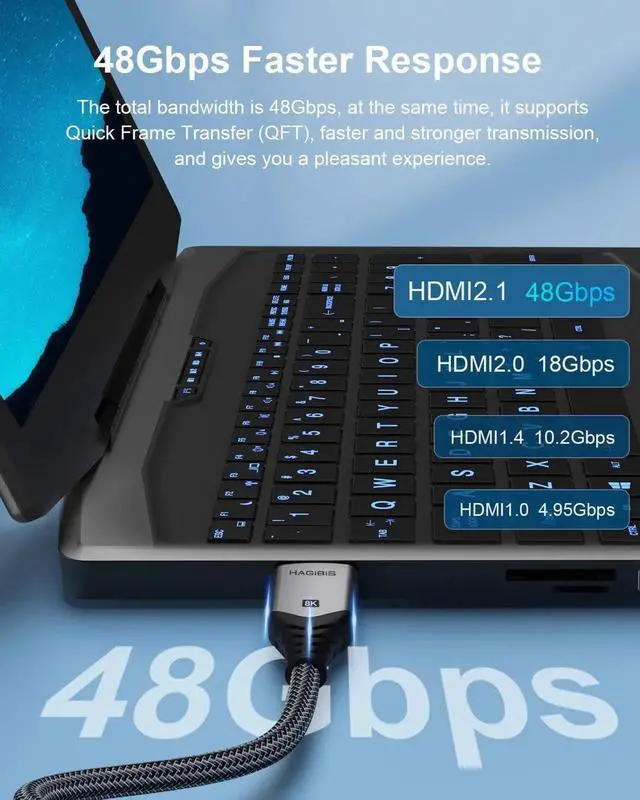 48Gbps Super High Speed This HAGiBiS ultra high speed HDMI Cable provides a high-speed 48Gbps solution for better picture and sound. Features 2 gold-plated connectors with anti-oxidation performance and excellent conductivity for super-fast transfer and superior connection. HDMI 2.1 port brings 48Gbps transmission quantity, and super clarity for view without any lagging so you never miss a beat. Besides, the cable also features very low EMI emissions.