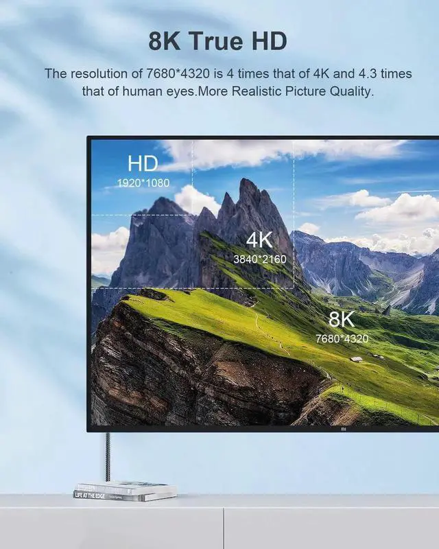 Ultra HD 144Hz HDMI 2.1 Cable 8K60, 4K120 & up to 10K resolution, Dynamic HDR, eARC, ALLM, QFT, QMS, VRR, and compatible with 8K 50Hz, 4K 120Hz UHD, 4K 100Hz and more, providing Ultra HD cinematic experience and 3D visual effects.