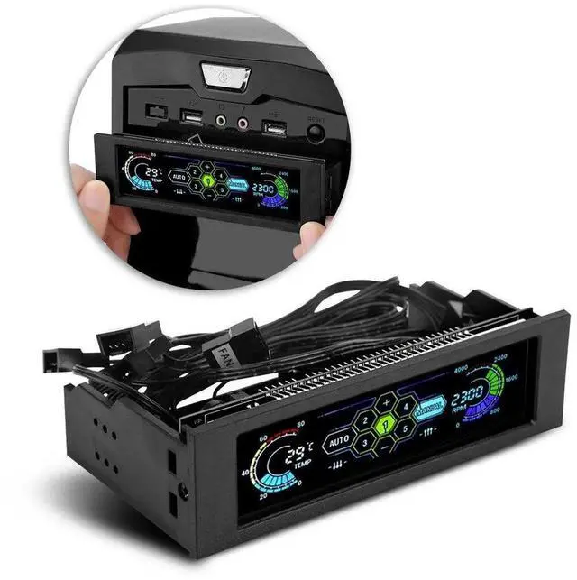 5-Fans Speed Computer Fan Controller CPU Temperature Sensor PC Cooling Fan Controller Front Panel Date Time Temperature Display Drive Bay