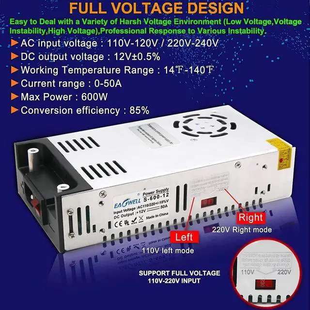 This versatile converter is widely used in various applications. It is the perfect choice for powering LED strips, 3D printers, CCTV systems, campers, medical equipment, industrial automation equipment, motors, car stereos, boats, radios, computer projects, humidifiers, research rooms, electrical equipment, solar photovoltaic systems, LED displays, air compressors, and more 12V devices. Please note that it is not suitable for electrolysis tanks
