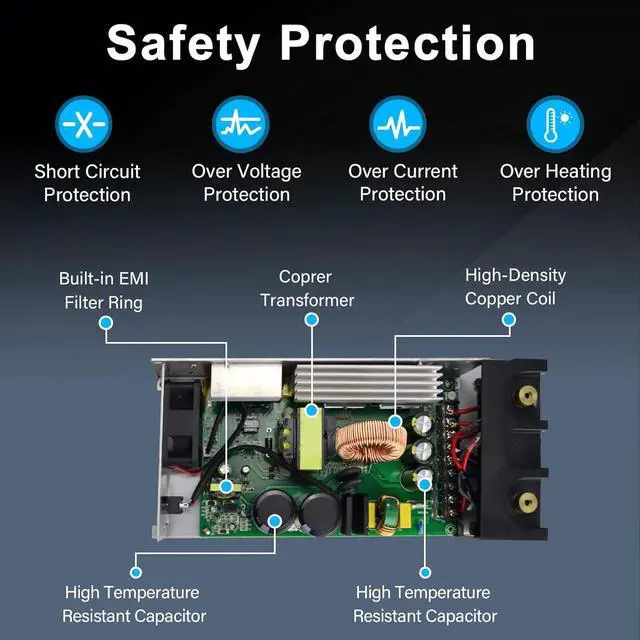 The built-in cooling fan protects the switching power supply from stable and efficient use and effectively prevents circuit board burnout, allowing it to work at full capacity within a temperature range of 14 to 140°F.