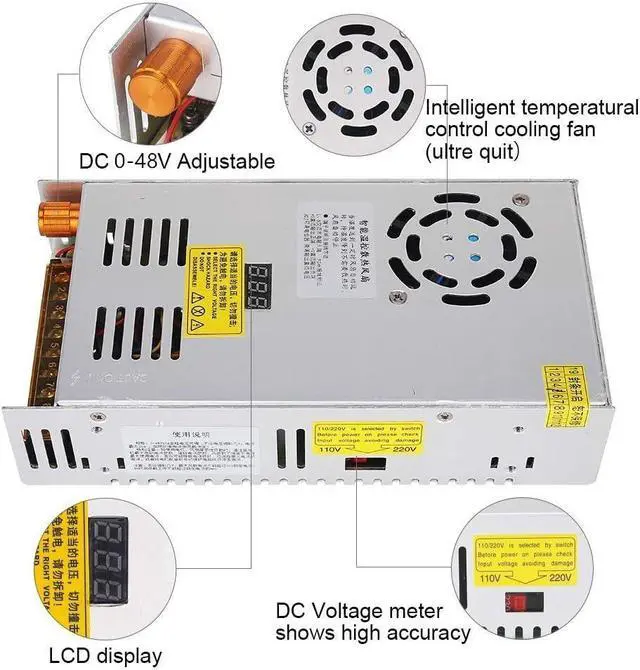 Over load protection, over voltage protection, short circuit protection, this protection will protect your load well. Input: AC110-220V, Output: DC 0-48V adjustable, Maximum output current: 10A.