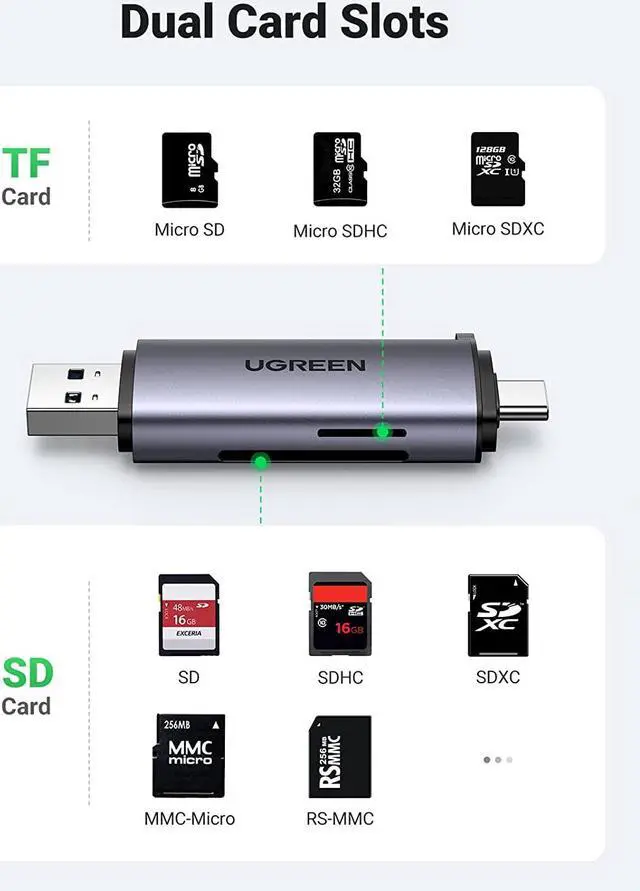 Read 2 Cards Simultaneously: The Micro SD card read read and write 2 cards simultaneously, keeping you away from the hassle of unplugging and replugging and improving work efficiency. The card reader also support data exchange between 2 cards