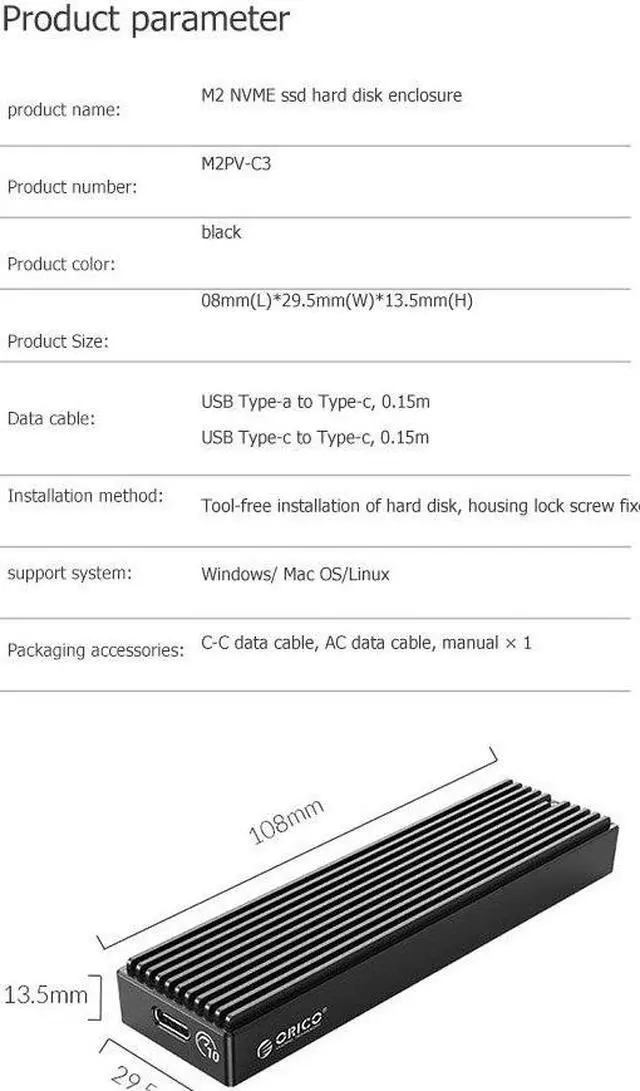 ORICO M2PV-C3 Type-C M. 2 NVME SSD Mobile Enclosure Aluminum Alloy USB 3.1 10Gbps External Solid State Drive Box Case for 2230 2242 2260 2280