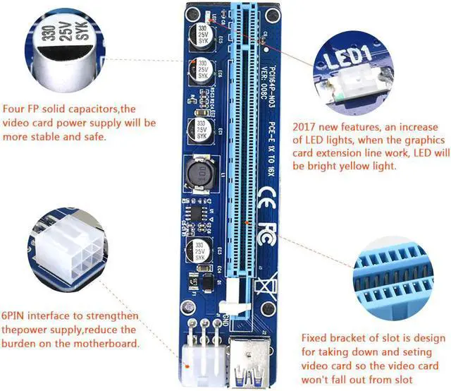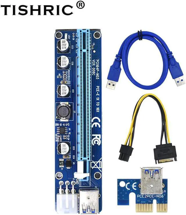 10pcs TISHRIC VER008C Molex 6pin PCI Express PCIE PCI-E Riser Card 1X 16X Extender 60cm USB3.0 Cable For Mining Bitcoin Miner