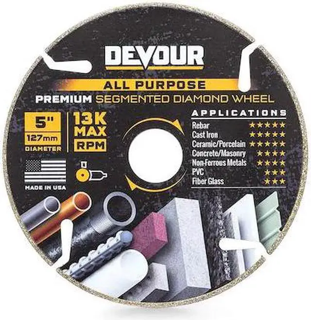 DEVOUR DIAMOND WHL 5"" - 2007494, Brand Name: NuTek Sub Brand: DEVOUR Diameter: 5 in. Material: Diamond Style: Segmented Product Type: Cutting Wheel Maximum Speed: 13000 rpm NuTek DEVOUR 5 in. Dia. Diamond Segmented Cutting Wheel.