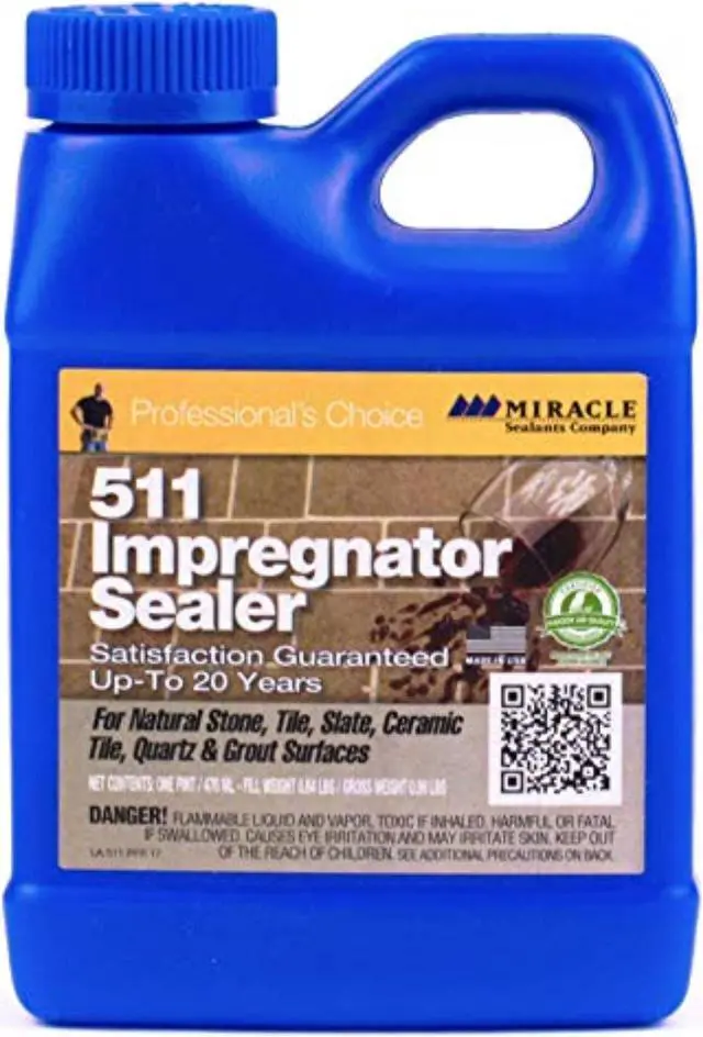 Miracle Sealants 511 PT SG Impregnator Sealer for Stone, Tile, Slate, Ceramic, Quartz 16 oz Pint From the Manufacturer 511 Impregnator is the original penetrating sealer designed for the protection of all medium to dense porous surfaces. 511 Impregnator forms an invisible barrier that is resistant to moisture and stains while allowing vapor to escape. 511 Impregnator is not a surface coating and will not alter the natural look. All surfaces treated are harder and less slippery. Interior and Exterior use , Weather resistant , OK for food areas , U.V. Transparent , Coverage: 1000 - 4000 square feet per gallon; 90 - 364 square meters per 3.785 liters