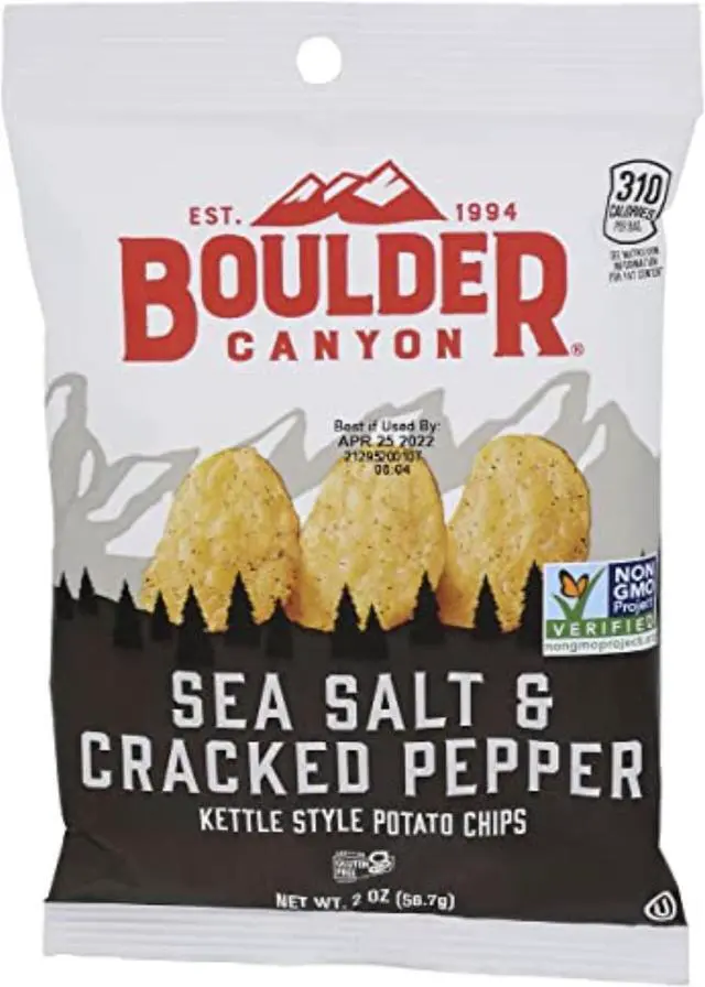 9064001 CHIPS SEA SALT&PEPPR 2OZ Boulder Canyon Sea Salt & Cracked Pepper Chips 2 oz Bagged Flavor: Sea Salt & Cracked Pepper ,Number in Package: 1 ,Package Size: 2 ,Packaging Type: Bagged ,Product Type: Chips ,Brand Name: Boulder Canyon ,Sub Brand: