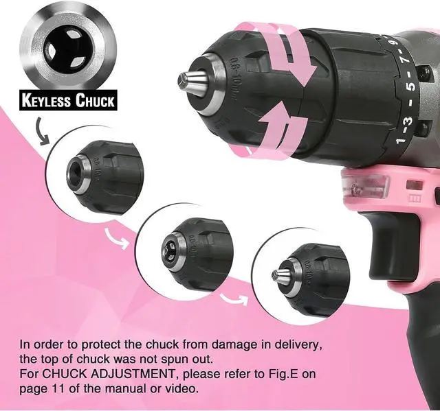 21+1 Torque Adjustment with Larger Chuck- Your new brand cordless rechargeable drill, delivering 203 in-Lbs (23N. M) of max torque, features 21+1 torque position clutch, which provides more precision of torque adjustment as needed. Large 3/8" (10mm) keyless chuck can provide you with superior bit retention